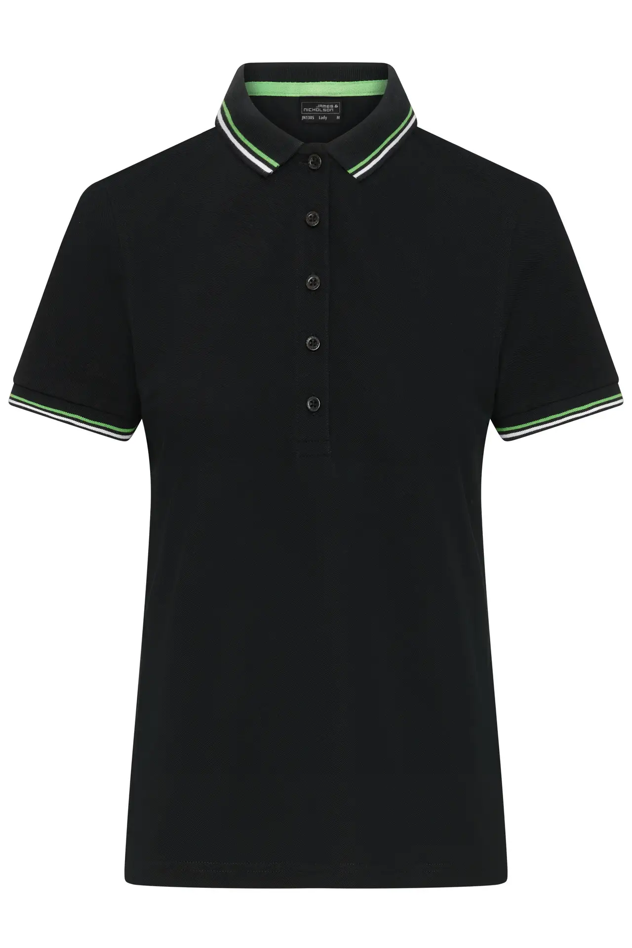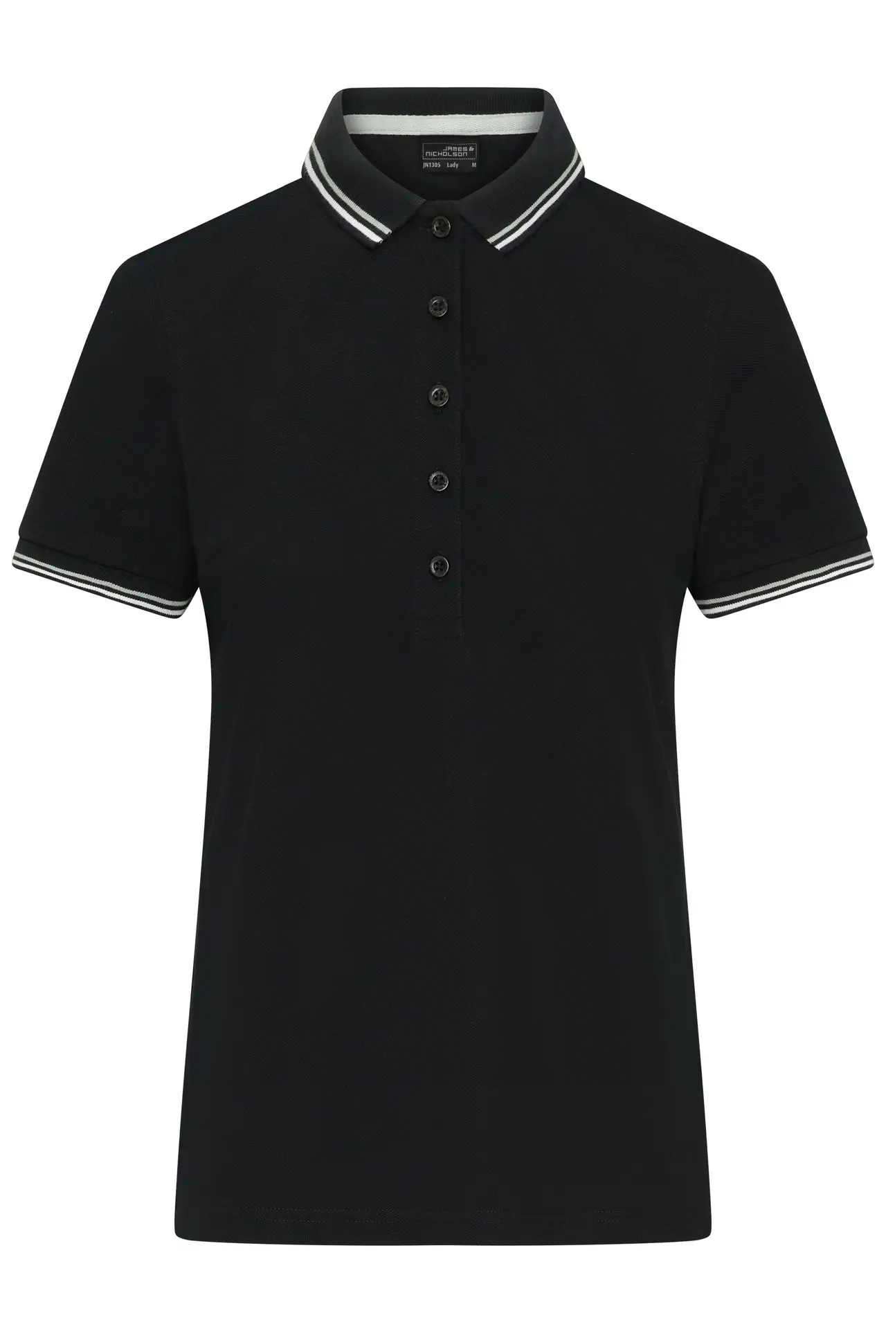 Classisk dame polo med kontrast farvede striber på ærmerib og krave. 5 knapper tone in tone og let faconsyet. Rundstrikket.