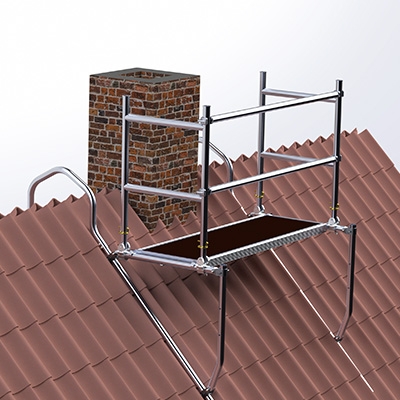 JUMBO Skorstensstilladset kan med sine rygbøjler hægtes på tagryggen og udgør dermed en Arbejdsplatform til f.eks. arbejde på skorsten. Rygbøjlerne er teleskoperbare med 1,50 m, således stilladset kan placeres længere nede på taget.